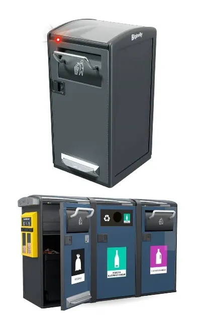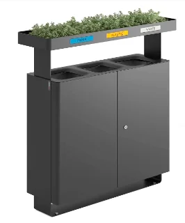 Smart, solar-powered, compacting waste or recycling station. This compacting model holds 5-10X real capacity over an average traditional waste bin. It is equipped with sensors that monitor and report fullness levels and collection activity