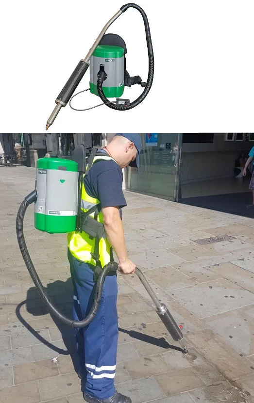 Urban waste vacuum cleaner collects and removes everything in its path: paper, cardboard, cigarette packets and ends, cans and bottles made of glass, plastic or metal, dog waste, dead leaves, rubbish trapped in tree grilles, wood/ steel/ aluminum shavings, etc.