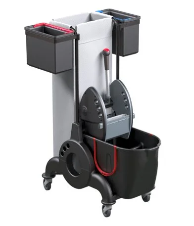 1 PP buckets each with capacity of 25 lt. Down press wringer. 80 mm pivoting wheels. 90 mm bumpers.