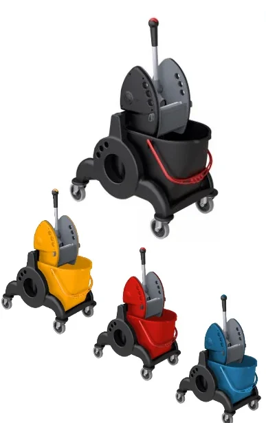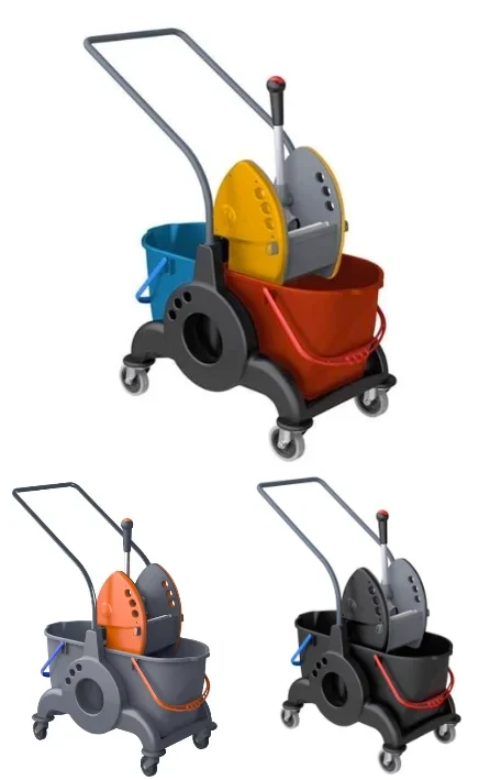 2 PP buckets each with capacity of 25 lt. Down press wringer. 80 mm pivoting wheels. 90 mm bumpers. central push handle